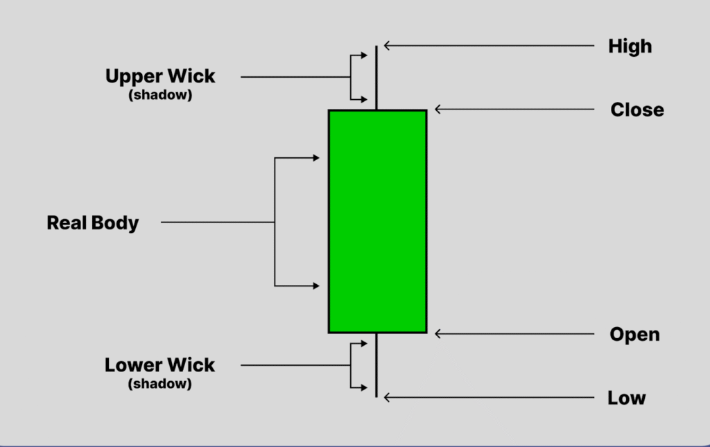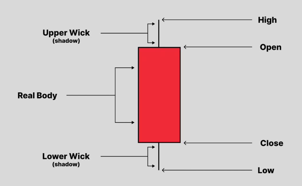 It’s called a candlestick because each “candle” on the chart looks like a candle with a body and wicks (or shadows). Candlesticks are formed using the open, high, low and close.